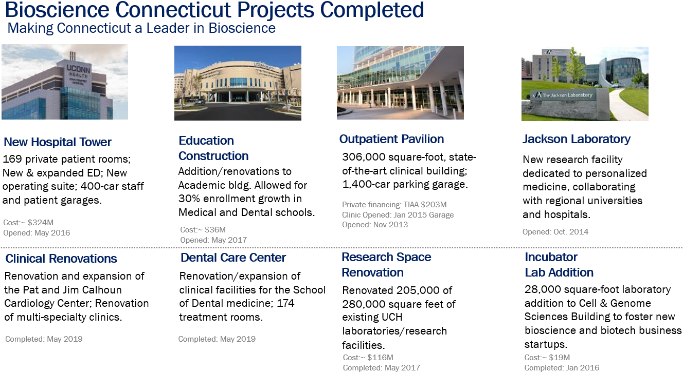 Bioscience Connecticut was an important component of the state’s plan to jumpstart Connecticut’s economy by creating construction-related jobs immediately and generating long term, sustainable economic growth based on bioscience research, innovation, entrepreneurship and commercialization.